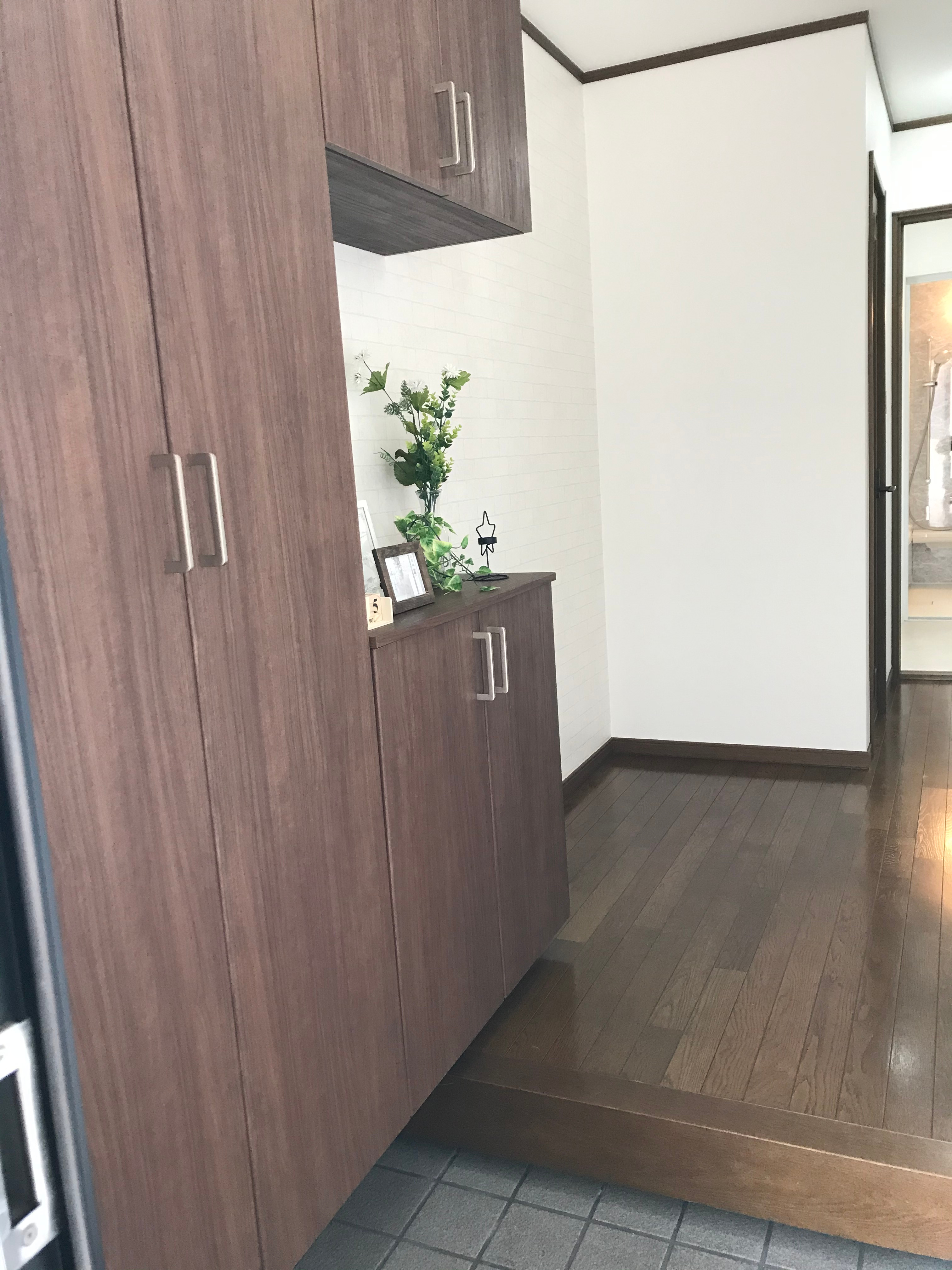 まだ一部を残しリフォーム中ですが、玄関をはいると画像のような大きなシューズBOXがある広い玄関です。